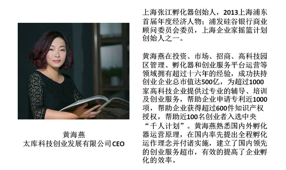 高尔基对海燕的描写正是本期《硅谷看世界》节目嘉宾的最好写照。今天来到丁丁电视演播室作客的是太库科技创业发展有限公司CEO黄海燕。从十几年前在一片农田上创建『张江孵化器』开始,黄海燕一直在创新路上勇往直前。凭借自己在投资、孵化器及创业服务平台运营等领域的长期经验累积,成功扶持创业企业总市值达500亿,帮助过的企业已有2000余家。2014年创立的全球创业生态系统『太库科技创业发展有限公司』目前已完成在中国北京、上海、深圳、固安、美国硅谷、韩国首尔、德国柏林、以色列特拉维夫等地布局,成为全球最大的孵化器专业运营公司。